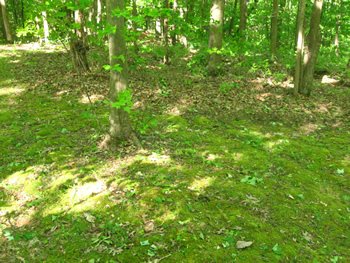 I mow the garden area every other week in the spring and summer. The yard, because of all the shade, is mowed just once a month. Most of the yard is covered with moss rather than grass, like here. The patches of sunlight are so bright. This is part of the yard at the edge, where yard turns into woods.