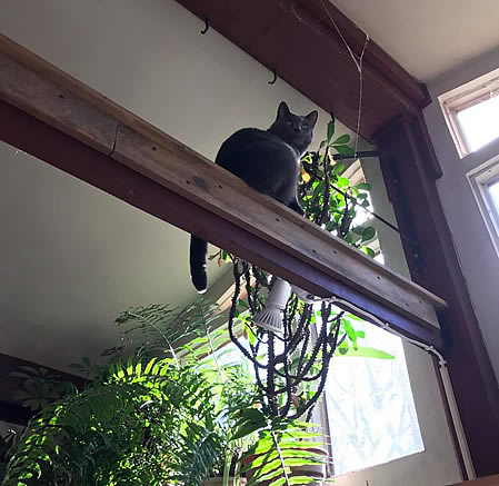 Willow is an adventure cat. In this photo she is sitting on a beam near the upper tier of windows in the main part of our home. The ceiling at this point is about 12 feet above the floor. The shelf where the plants are, over the kitchen, is one of the favorite spots in the house in summer when those plants are outside.