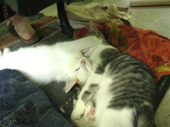 8/16 -- Grey and Blondie collapsed under the chair. They never lost their closeness from when they were baby kittens.