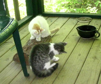 8/27 -- Both Grey and Blondie have figured out how to use the cat door to get out onto the screened porch off the addition. It's still a favorite play area.
