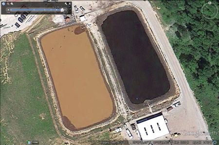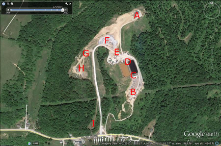 The facility is large and complex. A group of Google Earth images is available, keyed to the image below. Clicking on a letter will bring up that area's Google Earth image. The whole facility can also be seen. Area A was the site for injection well 47-085-09669. Area E is the site for injection well 47-085-09909. Areas B, E, G, and H appear to be used to store materials for drilling wells. Area F appears to have gravel and other materials and also serves as a helicopter pad. D and C are the two large pits on the site. The large building shown in C possibility is the flowback recycling facility. I is another well.