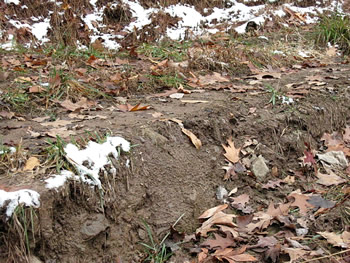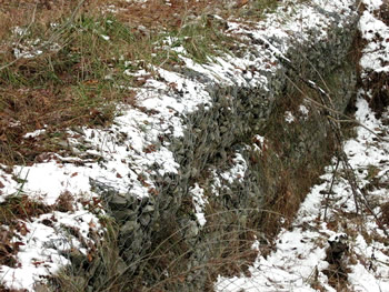 Looking downhill, the stone wall retaining structure is in the center of the photo.