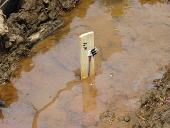 A chloride test strip held to a wood shim by a binder clip. The shim is standing in a large puddle. A sample number is written with a Sharpie on the shim.