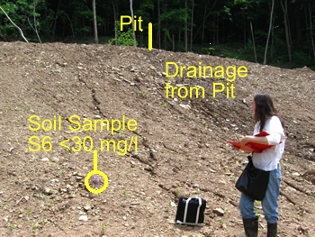 This is the fill slope showing drainage from the pit above and to the right of Molly. Soil sample S6 (<30 mg/l) is on the fill slope and away from visible drainage signs.