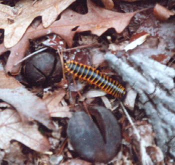 This is a centipede that is common around here. The round objects are hickory nut husks.