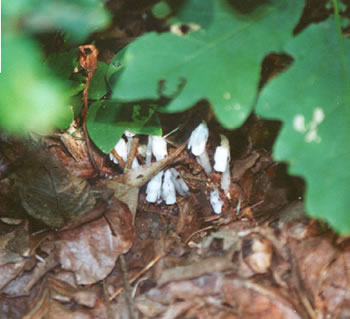 These are another plant called Indian Pipe appearing under the leaves of an Oak sapling. The whole plant is white, it has no chlorophyl. Delicate petal like leaves are attached to the stalks.