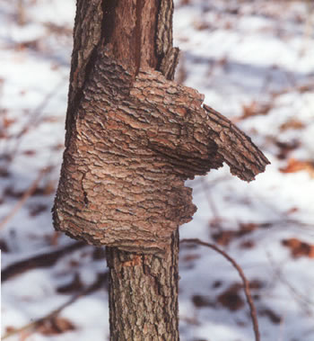 This is a view of a piece of bark starting to fall from a dead Dogwood tree. A virus has killed most of the Redbud and Dogwood trees on the ridge. The drier climate weve had recently is a factor I believe, as is the overall change in the woods that has taken place over the years as more mature second growth timber starts to block light going to the understory.