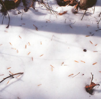 This is a picture of Pine needles lying on the snow. It creates a beautiful pattern that looks like it could be easily made into a Japanese textile print.
