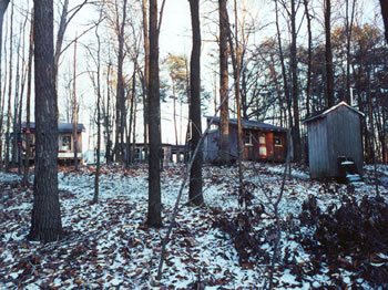 This is a late afternoon picture of our buildings looking uphill to the east. The House is to the left, the Shop next to the right and then the Shack. The small building in the foreground is the Privy.