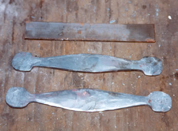The grip is ready to have the cusps forged. From top to bottom, the original size of stock, a piece after four heats, and a piece after six heats with the grip portion finished.