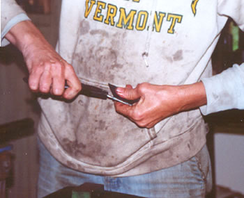 After rolling the eye, Molly drives the hinge piece out of the die with a hammer and then pulls the pin out of the die piece using a pair of pliers. It is a tight fit.