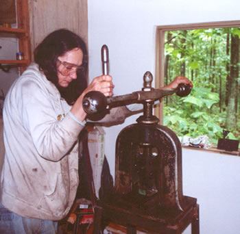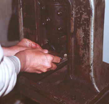 Once the die is under the ram, Molly swings the cross bar and the press screw forces the hinge piece through the tool. Notice the counter weights on the cross bar.