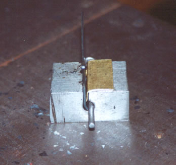 This is the die we use for rolling hinge eyes. The piece is placed in the die, a brass piece in the front keeps the hinge from scraping against the die while being rolled. The pin that the eye is being rolled around goes through the die.