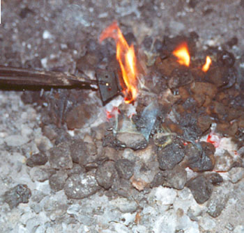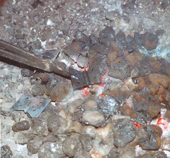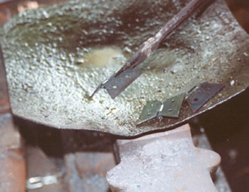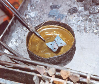 After being dipped in the finish, the hinge is again held over the fire so that the hot finish will reach every pore of metal.