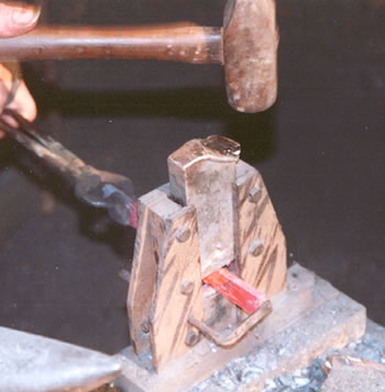 We use the blacksmith helper to fuller the stock to separate the material used for the cusp from the material used for the grip part of the latch.