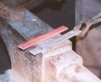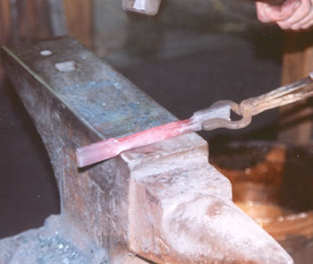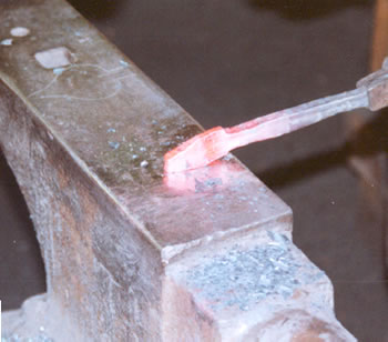 To start to create the heart shape on the cusp we put a point on the end of the cusp portion of the stock after upsetting it. This photo shows the point about half way through the heat. The stock will be drawn to a sharper point.