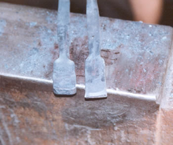 Weve upset the material for the cusp, driven it back onto itself while hot, holding it in the vise, so that it will be thicker. This will give us more metal when spreading the cusp.