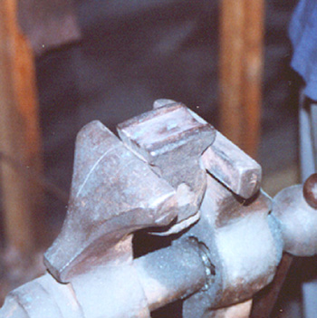 This photo shows an old top swage held in the vise. This tool is used to round the upper surface of the grip.