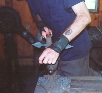 Before final forging of the cusps the grip edges are filed. The stock is held in a vise and filed with a 14 inch bastard file to refine the final shape of the grip portion of the latch.