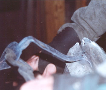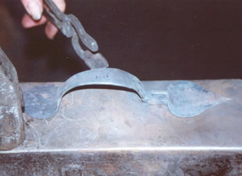 After the latch is filed, both grip ends are heated and bent in the vise using a hammer. The stock is then heated overall and shaped over a jig to create the latch grip. Finally the cusps and latch are straightened on the anvil, holes are punched and the final straightening and flattening of the cusps takes place.