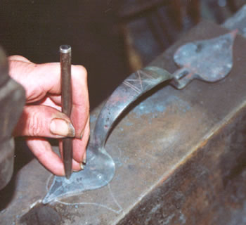 The position of the screw holes on the cusps is drawn using a silver pencil and center-punched. After this is done, the final heats further straighten the latch and make the cusps lie flat.