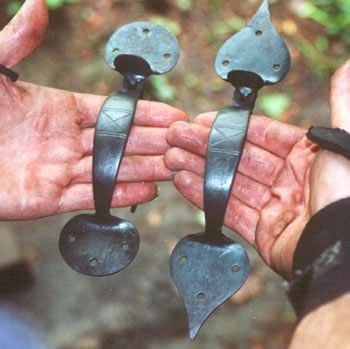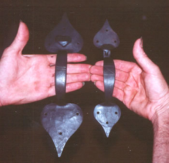 This photo shows two latches after receiving their hot finish. The finish is wiped off after they are cool. The latch to the left is a bean style. The latch to the right is the heart style.