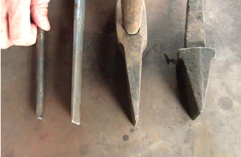 Hot cutting is done with a chisel or tool configured much like the common cold cut chisel, except the blade is much thinner and sharper. A cold cut chisel is shown to the left and next to is a hot slitting chisel, both of which are meant to be held in the hand and struck with a hammer. A handled hot cut chisel is shown next. To use this another person must be added to the forging operation either to hold the chisel or to strike it with a hammer while the blacksmith holds the hot steel to be cut in tongs on the anvil. The tool furthest to the right is a hot cut hardy, whose stem fits in the hardy hole of the anvil to hold the tool upright and secure there.