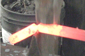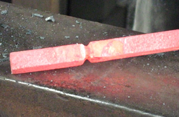 This is the dressed end of the half inch bar. Dressing is required to prevent a flaw in the forging from occurring from the rough hot cut end. Several heats were used to cut and dress the stock but if we did this all the time we could probably get it down to one heat.