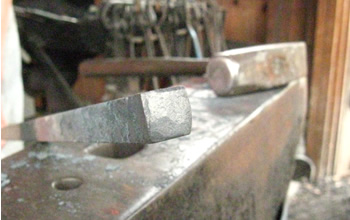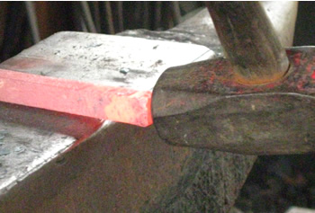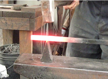 The half-inch bar has been reheated and its end is being struck repeatedly by the hammer to dress the end, making it smooth.