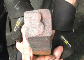 This is the end of a 1 1/2 inch bar that was cut hot using a hot cut hardy tool. As can be seen, there’s a rough area in the center. We used hot cutting in this instance for making a hardy tool for the anvil.