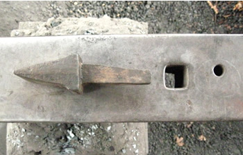 The final blows are struck to one side of the hardy’s edge so the hammer’s face won’t be marred by a misstrike. The final blows must have enough power to complete the cut, but not so much that the cut off piece goes flying to the other side of the shop!