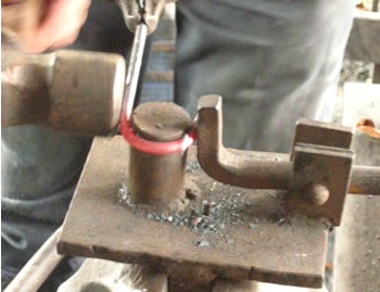 In this photo the ends of the piece of stock have already been forged and the hole punched for the screw before the shaping process begins.
