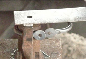 After reheating the stock, the second bend is made and the piece is measured to make sure it is the proper size, 2 5/8 inches long. We try to get the grips close to this size, plus or minus a little. Blacksmithing is not an extremely precise art.