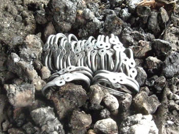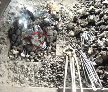Coke is placed around and over the grips and they are left to warm slowly. We turn the blower handle only now and again to maintain the fire.