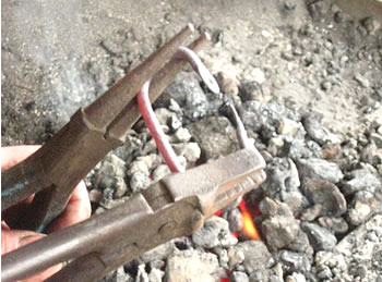 When heated thoroughly, the pieces are removed from the fire one at a time and twisted open using two pairs of pliers. After all the grips are opened, they are placed again in a soaking fire, this time with the forged ends downward for best heating.