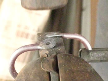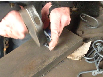 Next the grips are taken from the fire one at a time and the forged ends are shaped over a tool held in the vise. We use a hammer to flatten the forged ends against the tool.