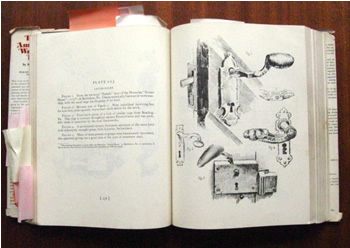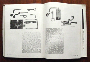 Another important reference is Donald Streeter’s Professional Smithing: Traditional Techniques for Decorative Ironwork, Whitesmithing, Hardware, Toolmaking, and Locksmithing (New York: Charles Scribner’s Sons, 1980). Streeter points the way for a blacksmith wishing to reproduce hardware such as that shown in Sonn. The pages shown here describe the making of a German-style lever latch and lock, and show the forge template for the knob amongst the other parts of a latch and lock.