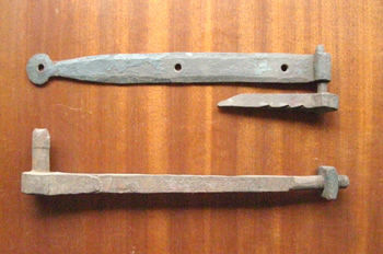 Here is one of a pair of strap hinges with pintles we found in Western Ohio years ago. The hinge is 13 3/8 inches long. Below the hinge is a pintle which passed through a post and was held by a large nut. This probably was used in a barn for a door.