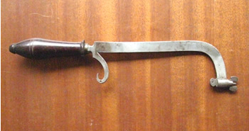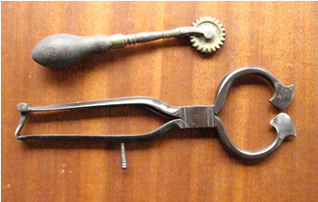 Our own “library” has objects ranging from those used domestically to hardware and tools. Amongst the domestic objects we have are the pie crimper and sugar nipper shown here, both nineteenth century. The pie crimper has a walnut handle, brass ferule and wheel, and a forged and turned shaft to hold the wheel. Sugar nippers were used to break pieces off the large chunks of sugar that were standard in those days before granulated sugar. This pair was made in England.