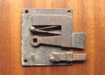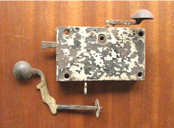 This is a German-style lever latch, with a night latch, still graced with paint. This again is from the early nineteenth century. These are found in dwellings in areas settled by Germans in areas of Europe where artisans were influenced by German-style hardware. Pressing on the knob or handle releases the lever by raising it from the catch (not shown).