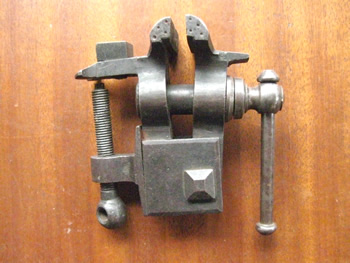 This is a small Lancashire pattern vise meant to be screwed onto a table or workbench. There’s a small anvil on the vise chop flange, and if one looks closely they’ll see depressions on the ends of the jaws. These are for holding one end of a bow drill bit, where the bit rides in the depression, a wheel on the bit is driven by a bow, and the work is held against the bit as it is turned.