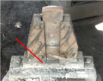 An important tool in our shop is the blacksmith helper -- a jig holding moveable dies, one of which is struck by a hammer. We made this helper using nuts and bolts to hold the vertical parts together. These were then brazed to the base in the fire. Brazing is done by heating the iron or steel hot enough so that brass will melt when it comes in contact. Brazing makes a strong joint, much stronger than soldering, almost as strong as welding. This blacksmith helper has been in constant use for over 15 years. We’ll do a post soon on how the blacksmith helper works and the dies we use.