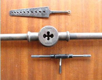 At the top is a Lancashire pattern die plate from the early nineteenth century. Each hole in the plate cuts threads for bolt-like fasteners. We use modern die holders with interchangeable dies for each size thread, like the half-inch dies in the center. At the bottom is a modern tap for cutting threads in a hole for nut-like fasteners. The die plate at one time also had its taps.