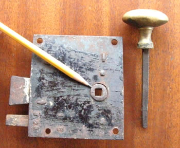 This is the back of the spring latch that was shown in a previous post along with a knob. The parts of the spring latch were attached to the back plate by riveting -- peening, lightly hammering, the metal protruding from the hole until it no longer fits through the hole and forms a secure fastening. The lever itself is held to the back plate by peening over the edges of the boss; where the pencil is pointing. The brass knob was made of three pieces: thin front and back ovals soldered together and soldered to a turned brass shaft. The knob is held to the long iron shaft by a pin.