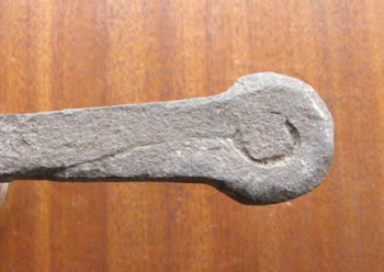 Forge welding was a frequently used way to fasten two pieces of iron or steel together. Forge welding is done by heating the pieces at the same time in the fire to just below melting temperature -- about 2,000 degrees Fahrenheit. The pieces are taken from the fire and, on the anvil, hammer forged lightly to join them. Low carbon wrought iron welded easily without burning, unlike higher carbon steels today. This is the bottom of the large pintle shown in a previous post. The pintle and the wrapped joint are easily visible after the weld.