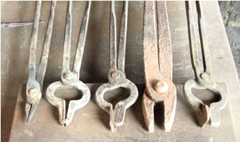 For forging and shaping a thumber we use 4 tongs, and another pair is used to manipulate the stock in the fire. From left to right are fire tongs for removing pieces from the fire, a pair of v-tongs to hold the round stock, a pair of ½ inch flat tongs for holding the tail of the thumber during forging of the thumb press, and two tongs for holding and shaping the thumber around a jig.