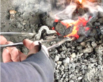 The stock for thumbers for HF14 Suffolk Latches is 3/8 inches round, 3 ¼ inches long. We use the fire tongs (to the right in this photo) to manipulate this small piece of metal in the fire. The stock is being drawn out of the fire and will be handed off to the waiting v-tongs held in the left hand.