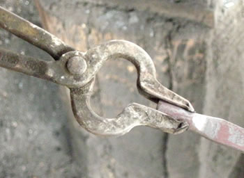 We’re right handed so we hold the hammer in that hand. Even though the tongs are held by the left hand, that doesn’t mean that dexterity isn’t needed. During a forging tongs are raised and lowered, shifted right or left, turned slightly or continuously. Like an athlete or a dancer, a blacksmith must hold many things in awareness at the same time. Tongs hold the hot stock and what they do is just as important as what the hammer does.