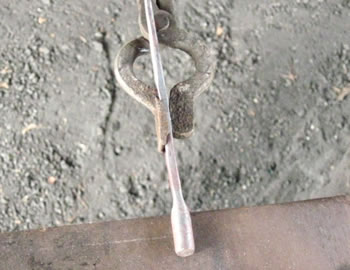 The v-tongs hold round or square stock extremely well. The end that will become the thumb press is held while the tail of the thumber is forged.