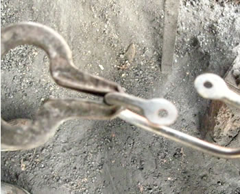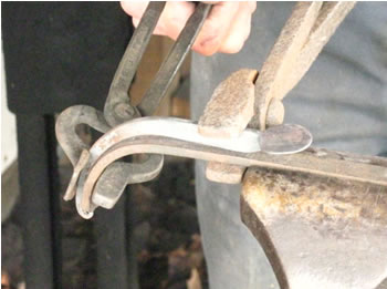 Thumbers, after forging, are shaped on a simple jig. The tongs to the right hold the thumber to the jig and the tongs on the left (a pair of ¾ inch flat tongs) is used to bend the tail to the shape of the jig. The parts of the jaw of the shaping tongs that are used are the pusher and the base of the other jaw, behind the “U”.